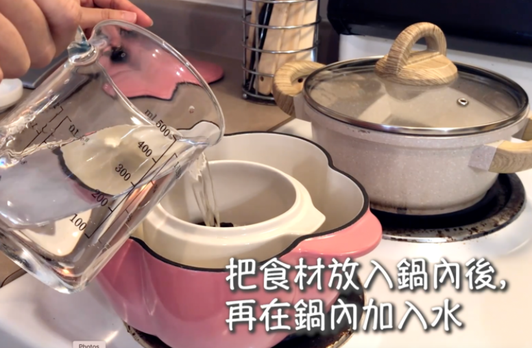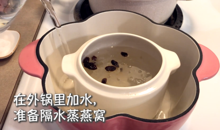 然后把燕窝、桃胶、以及枸杞放入炖锅中,在外锅加入水,隔水炖煮45分钟。