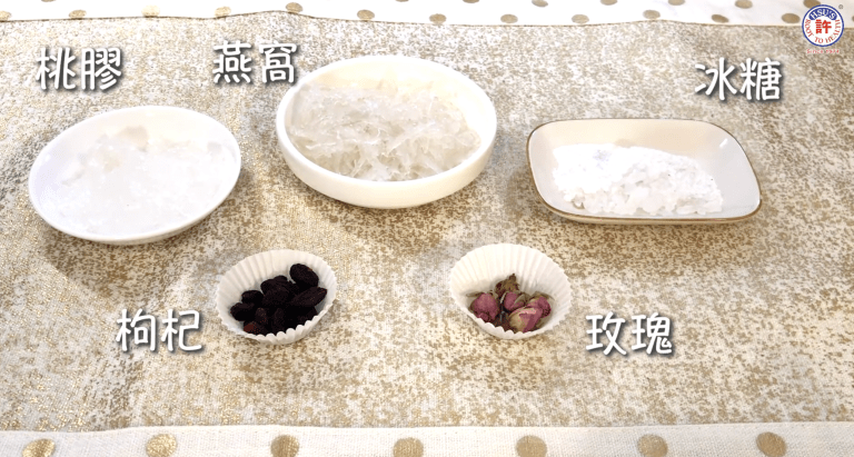 所需食材包括:桃胶、燕窝、冰糖、枸杞、玫瑰